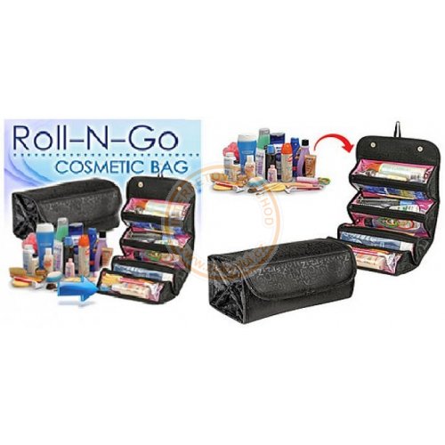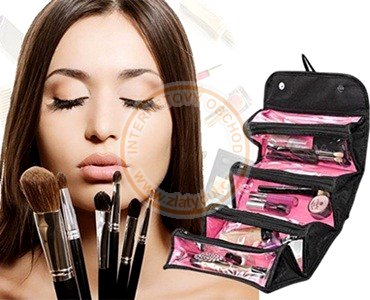 Rozkládací kosmetická taštička Roll-N-Go je v elegantním černém provedení z měkkého materiálu příjemného na dotek, který je dokonalou imitací kůže. Ve složeném stavu měří přibližně 25 centimetrů, když se rozloží, má délku cca 51 centimetrů. Poskytne Vám bohatý úložný prostor a umožní Vám přehledně uspořádat veškeré kosmetické potřeby. Uvnitř této toaletní taštičky naleznete čtyři průhledné kapsy o šířce 11 centimetrů, které mají navíc zapínání na zip, abyste své kosmetické potřeby nikde nepoztráceli. K zapínání slouží dva magnety. Na vrchní straně taštičky se nachází praktické poutko, na které ji můžete v případě potřeby pověsit.